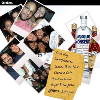 Realmente estoy muy desubicado de estos medios, pero es que tengo 2 trabajos y como 1000 picoteos que no me dejan respirar, de verdad que extraño escribir en el blog pero se me hace cada vez más dificil, no lo voy a cerrar porque se que por lo menos una vez al mes escribiré, espero que algún día pueda meterle mano diario de nuevo. Me informaron que hay un coro blog, le dejo aquí el afiche que anda por los blogs, rumba de charlatanes, poniendo ahí dique que yo llegué tarde al coro anterior, yo llegue en hora dominicana! jejejeje. No se si voy a ir, porque al yo estar tan desubicado tanto en la escritura como en la lectura de blogs no conozco casi a nadie ya, pero si voy llegaré temprano esta vez. Por favor de informarme quien sea, si cambian la fecha o el lugar del coro blog porque si es por leerlo en el blog de alguien no me voy a enterar.